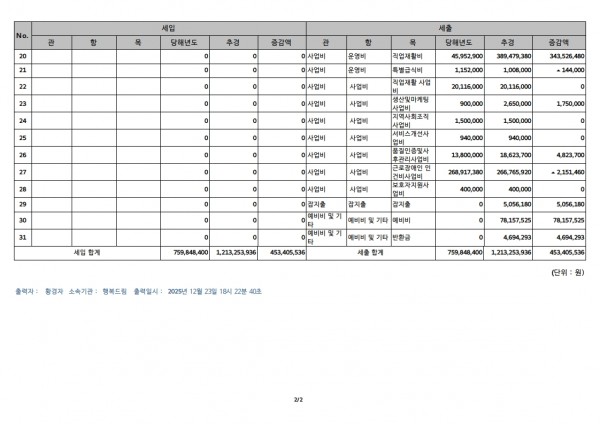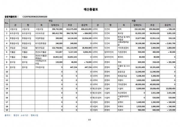 인쇄 스크랩 목록 2025년 행복드림 추경예산서 페이지 정보 비츠 88 0 2025-12-24 13:58:18 본문 2025년 행복드림 추경예산서를 공지합니다. 인쇄 스크랩 목록 이전글 ▲2026년 행복드림 예산서 다음글 ▼2025년 12월 행복드림 소식지 입니다. 댓글목록 등록된 댓글이 없습니다. 이전글 다음글 목록