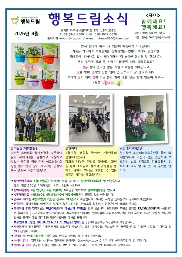 인쇄 스크랩 목록 2026년 4월 행복드림 소식지입니다. 페이지 정보 비츠 90 0 2026-03-31 11:17:29 본문 인쇄 스크랩 목록 다음글 ▼2025년 행복드림 결산서입니다. 댓글목록 등록된 댓글이 없습니다. 다음글 목록